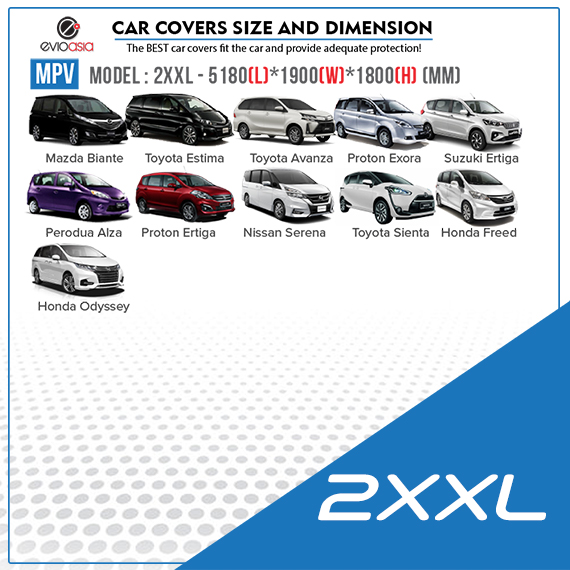 | Size | 2S (hatchback), 2L (hatchback), 3M (sedan), 3L (sedan), 3XL (sedan), 3XXL (sedan), YM (SUV), YL (SUV), YXL (SUV), 2XXL (MPV), SE01 (MPV) |
