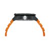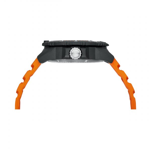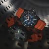 The Navy SEAL 3600 Series comes in different color variations, with this watch being the blue with orange accents, and orange rubber strap. It is a carbon-compound watch that features a hydraulically-stamped dial protected by a sapphire crystal with anti-reflective coating and a magnifier for the date display.