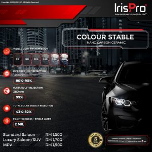 Specification Brand: IrisPro Category: IrisPro Colour Stable Series Product Warranty: 5 Years performance warranty Car Variant Type Available Package: Normal Saloon Normal Price: RM1,700