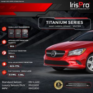 Specification Brand: IrisPro Category: IrisPro Titanium Series Product Warranty: 5 Years performance warranty Car Variant Type Available Package: Normal Saloon Normal Price: RM2,800