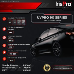 Specification Brand: IrisPro Category: IrisPro UVPro 90 Series Product Warranty: 7 Years performance warranty Car Variant Type Available Package: Normal Saloon Normal Price: RM2,600